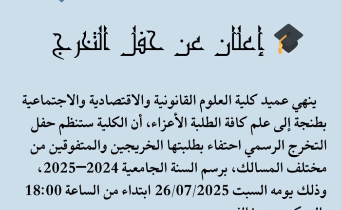 إعلان تسجيل الطلبة المقبولين بصفة نهائية تكوين الدكتوراه في الدراسات القانونية والاقتصادية والتدبير والتنمية المستدامة والرقمنة (القانون الخاص – القانون العام – الاقتصاد والتدبير) الموسم الجامعي: 2025/2026
