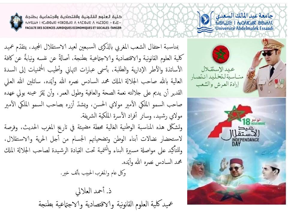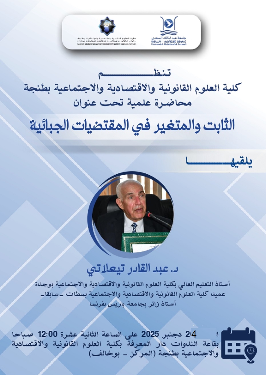 يعلن السيد عميد كلية العلوم القانونية والاقتصادية والاجتماعية بطنجة إلى علم الطلبة المقبولين بصفة نهائية لولوج تكوين الدكتوراه في الدراسات القانونية والاقتصادية والتدبير والتنمية المستدامة والرقمنة) القانون العام – القانون الخاص – الاقتصاد والتدبير (برسم الموسم الجامعي 2025/2026 أنه يتعين عليهم استكمال إجراءات التسجيل النهائي لدى مصلحة البحث والدكتوراه بالملحقة 1 للكلية قرب المدرسة الوطنية...Read More