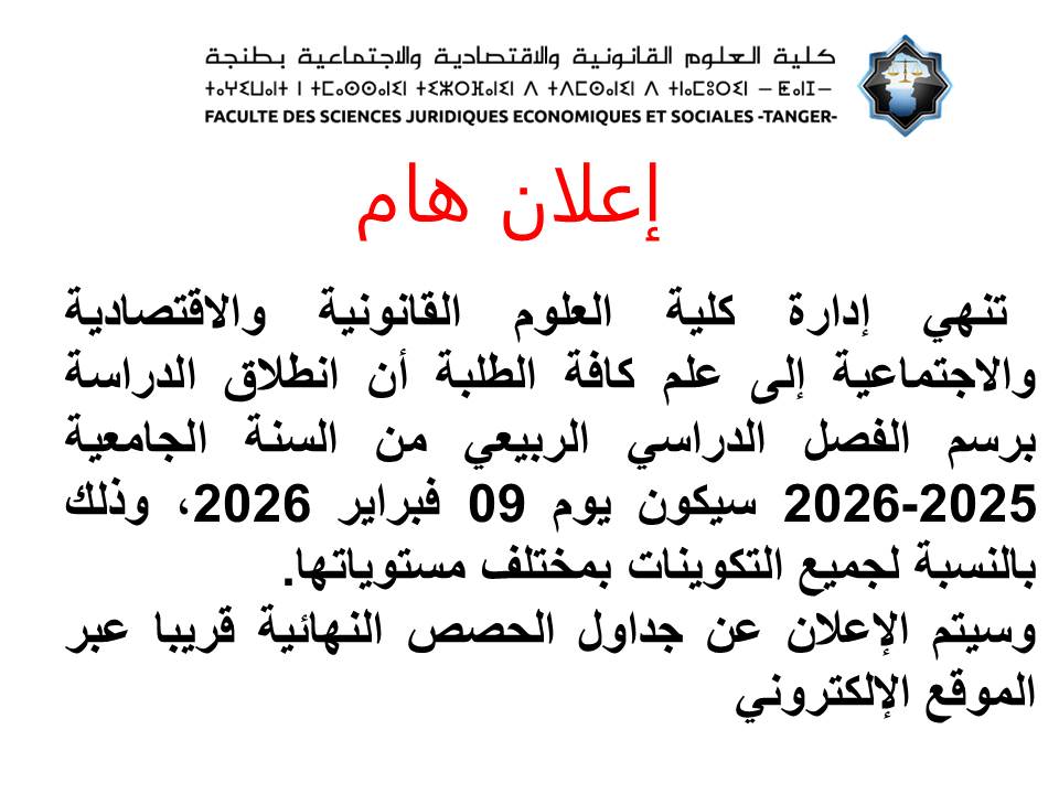 تنفي إدارة كلية العلوم القانونية والاقتصادية والاجتماعية بطنجة نفياً قاطعاً ما ورد من مغالطات متداولة في بعض المواقع الإلكترونية الإخبارية بشأن ما وُصف بـ“تجاهل” قرارات وزارة التعليم العالي والبحث العلمي والابتكار المتعلقة برسوم التسجيل بسلك الماستر في إطار التكوين وفق الزمن الميسر، وتؤكد أن ما تم تداوله يتضمن معطيات مغلوطة وغير دقيقة.    وتوضح...