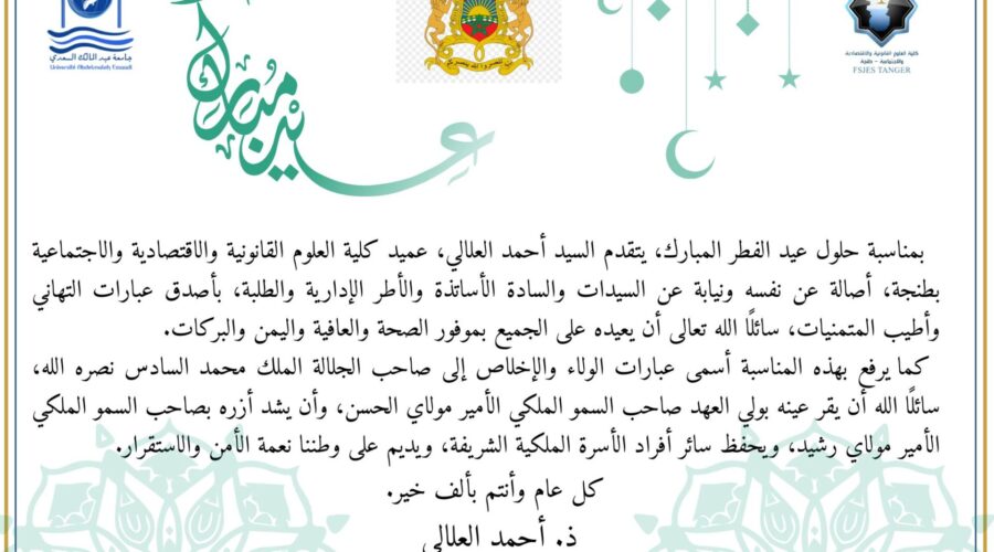 بسم الله الرحمن الرحيم تلقينا ببالغ الأسى وعميق الأسف نبأ انتقال والدة زميلتنا فاطمة الزهراء المرسلي إلى جوار الله تعالى. وبهذه المناسبة الأليمة، يتقدم عميد الكلية نيابة عن كل الموظفين: إداريين وأساتذة، إلى أسرة الفقيدة بأحر عبارات التعازي والمواساة، داعيا الله العلي القدير أن يتغمد الفقيدة العزيزة برحمته الواسعة وأن يسكنه فسيح جناته مع النبيين والصديقين والشهداء والصالحين، ويلهم أهلها وذويها الصبر والسلوان. إنا لله وإنا إليه راجعون. Lire la suite