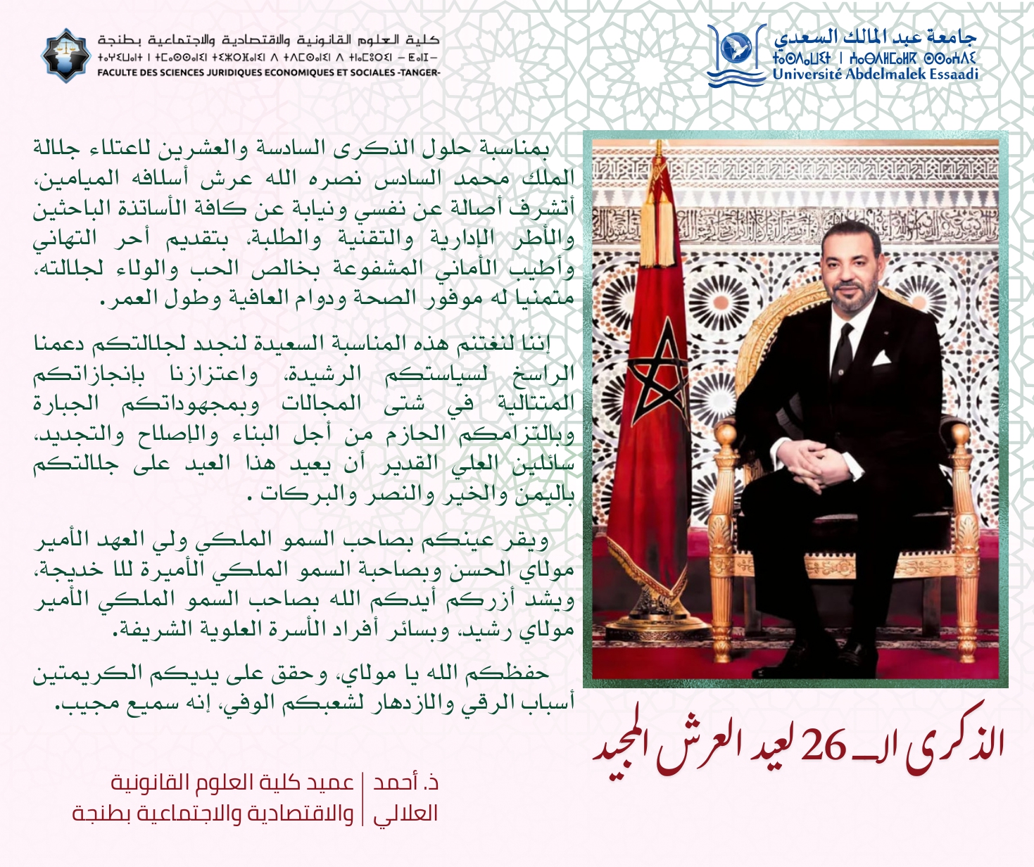 طنجة، الخميس 09 أكتوبر 2025 في إطار جولاته التفقدية قام السيد بوشتى المومني رئيس جامعة عبد المالك السعدي بزيارة ميدانية إلى كلية العلوم القانونية والاقتصادية والاجتماعية بطنجة رفقة السيد عميد الكلية ونواب العميد ورؤساء الشعب وعدد من أعضاء الطاقم الإداري. خلال هذه الزيارة تم الوقوف على مجموعة من الإنجازات والمستجدات البنيوية بالمؤسسة خاصة ما يتعلق...Read More