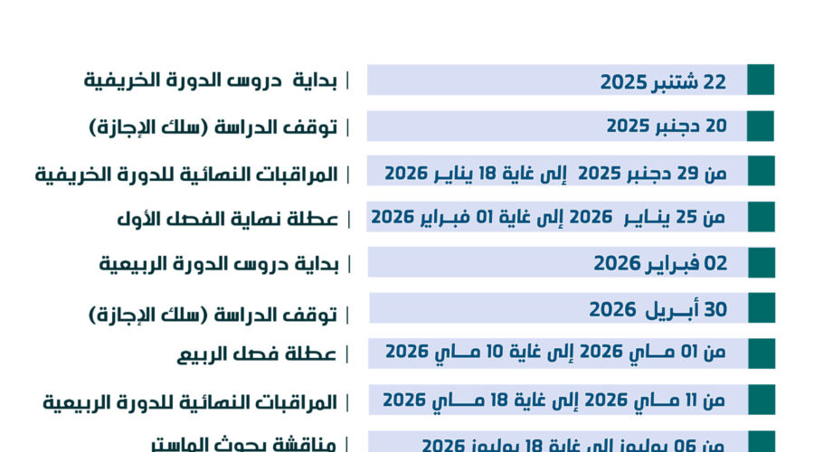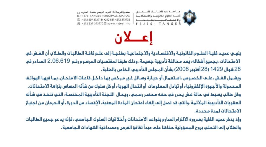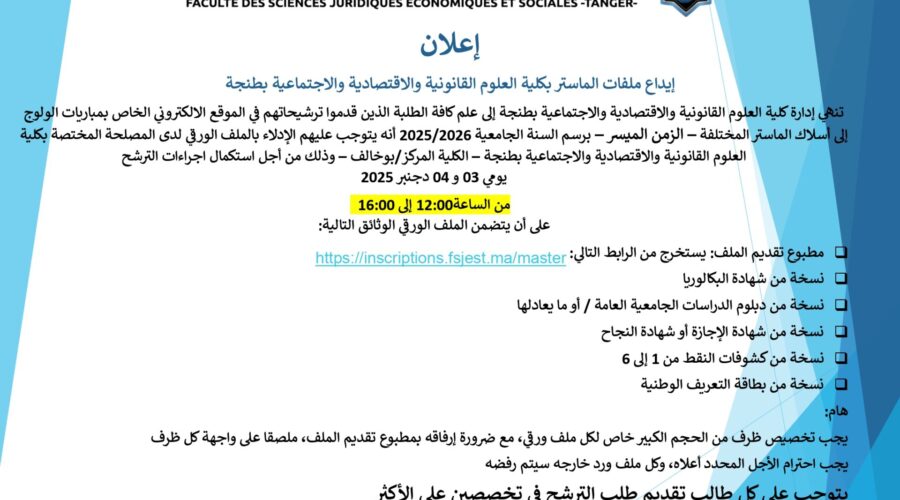 يعلن السيد عميد كلية العلوم القانونية والاقتصادية والاجتماعية بطنجة إلى علم الطلبة المقبولين بصفة نهائية لولوج تكوين الدكتوراه في الدراسات القانونية والاقتصادية والتدبير والتنمية المستدامة والرقمنة) القانون العام – القانون الخاص – الاقتصاد والتدبير (برسم الموسم الجامعي 2025/2026 أنه يتعين عليهم استكمال إجراءات التسجيل النهائي لدى مصلحة البحث والدكتوراه بالملحقة 1 للكلية قرب المدرسة الوطنية للتجارة والتسيير، وذلك وفق البرنامج التالي: بالنسية للطلبة المتوفرين على شهادة عدم العمل: يومي 25...