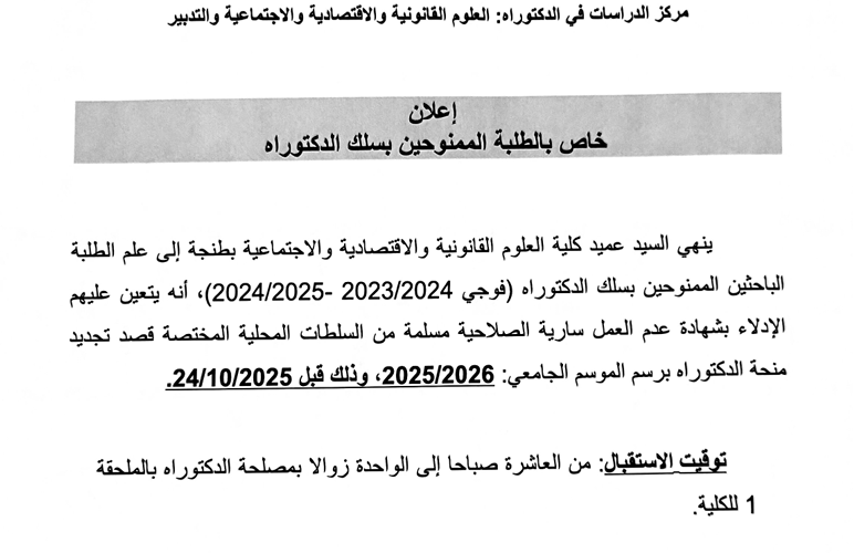إعلان خاص بالطلبة الممنوحين بسلك الدكتوراه