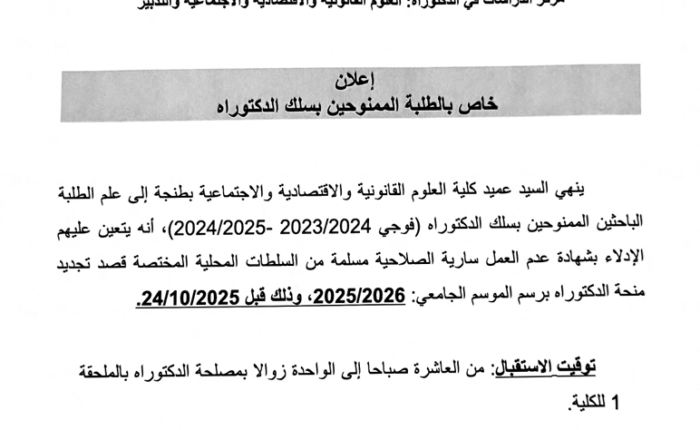 إعلان خاص بالطلبة الممنوحين بسلك الدكتوراه