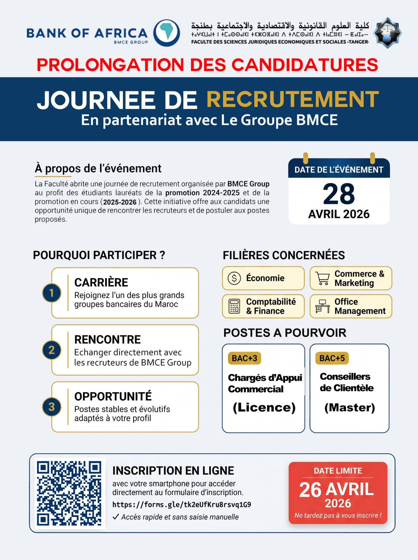تنهي إدارة كلية العلوم القانونية والاقتصادية والاجتماعية بطنجة إلى علم كافة الطلبة الذين قدموا ترشيحاتهم في الموقع الالكتروني الخاص بمباريات الولوج إلى أسلاك الماستر المختلفة -الزمن الميسر- برسم السنة الجامعية 2025/2026 أنه يتوجب عليهم الإدلاء بالملف الورقي لدى المصلحة المختصة بكلية العلوم القانونية والاقتصادية والاجتماعية بطنجة وذلك من أجل استكمال اجراءات الترشح على أن يتضمن...Lire la suite